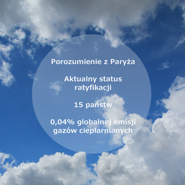 Aby porozumienie stało się obowiązującym traktatem międzynarodowym, to zgodnie z art. 21 paragraf 1 musi ono zostać ratyfikowane przez 55 stron UNFCCC, których emisje gazów cieplarnianych stanowią łącznie 55% całkowitej globalnej emisji. Widać zatem, że to nie jest taki łatwy i szybki proces jak to czasem mogłoby wynikać z przekazów prasowych. Podpisanie w blasku fleszy niestety ale nie niesie ze sobą żadnych prawnych skutków jeśli chodzi o wejście w życie Porozumienia z Paryża. Czy jednak któreś państwo ma za sobą ratyfikację?